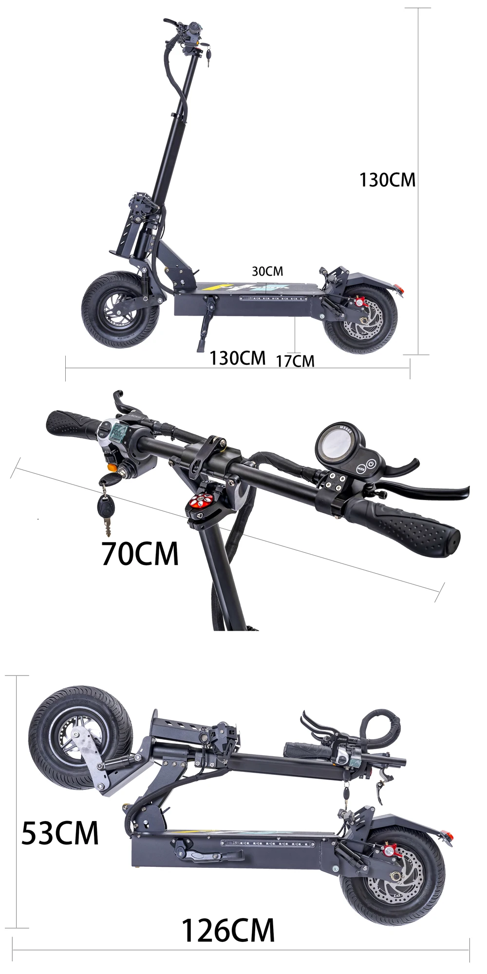 Features: front and rear invisible shock absorbers, front and rear hydraulic brakes + electronic brake EBS, cruise control, 12-inch explosion-proof vacuum tires, one-second folding, color LCD display instrument, support dual charging