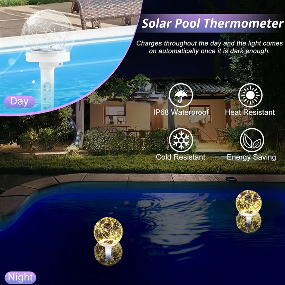 1. Enjoy Optimal Water Temperature: Our solar fairy pool temperature thermometer combines the functionality of an easy read swimming pool thermometer with the enchanting aesthetics of floating pool lights. Like stars twinkling in the galaxy, relax and enjoy your swim with the added bonus of being able to read the temperature even after dark, thanks to the unique lighting design powered by solar panels.