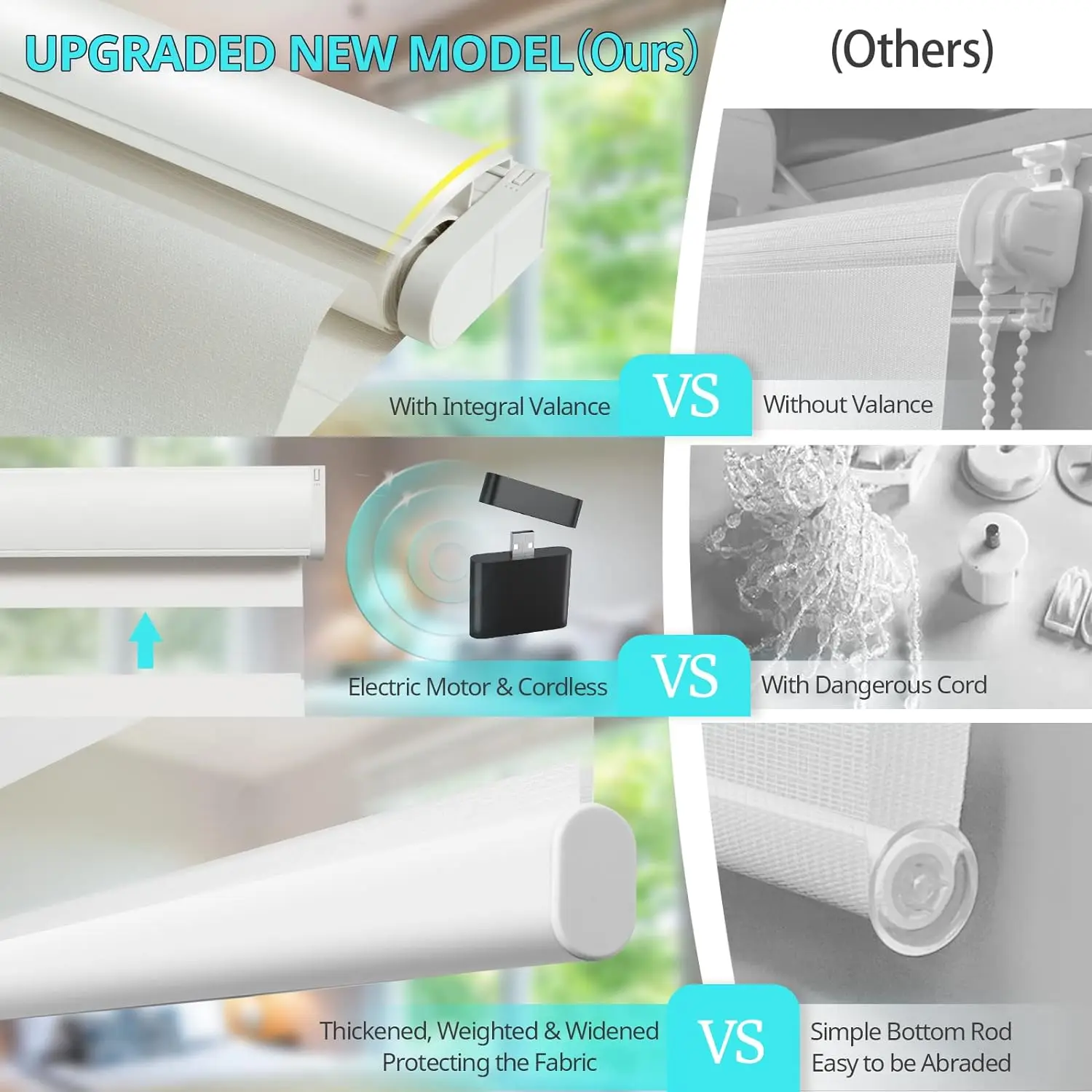 - ADVANTAGES OF ELECTRIC SHADES: These electric shades for windows can easily stop light from fading your furniture, paintings, etc. Just program the electric shades to go down at the time when the harsh light goes into the room, then problem is solved. Even if you go on vacation, what's something you are worried about at home? Nobody will take care of your house? Now electric shades are protecting in front of your windows, pretending someone is at home. Your house is safer than ever.