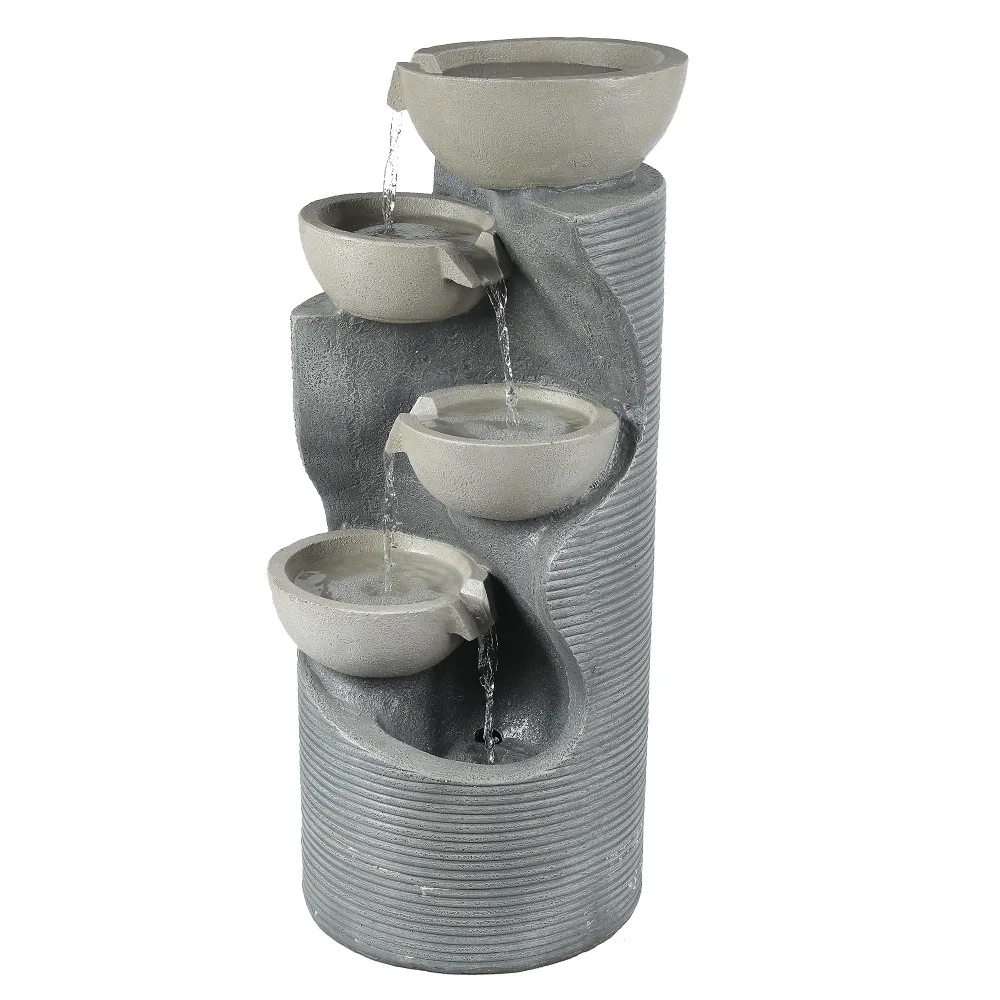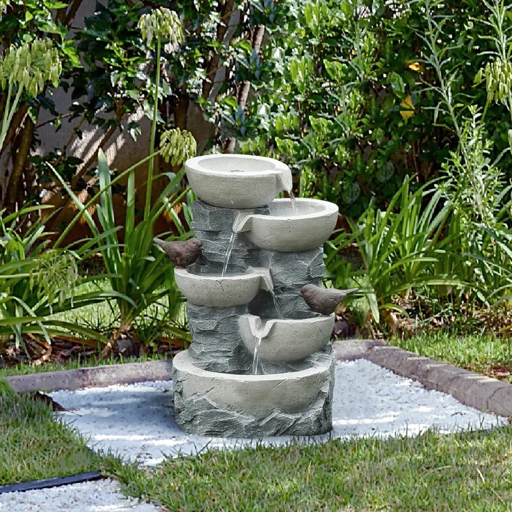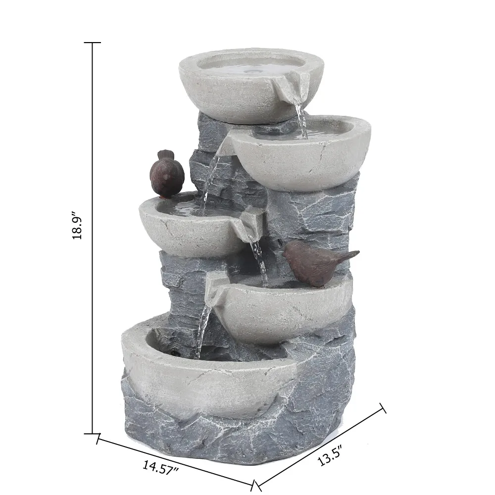 - With the suitable size 18.9" H x 14.6" W x 13.8" D for indoor or outdoor décor.Outdoor farmhouse fountain is four-bowl staggered design with two bird fountain sculpture and the gray stone finish complements any natural environment and landscape.