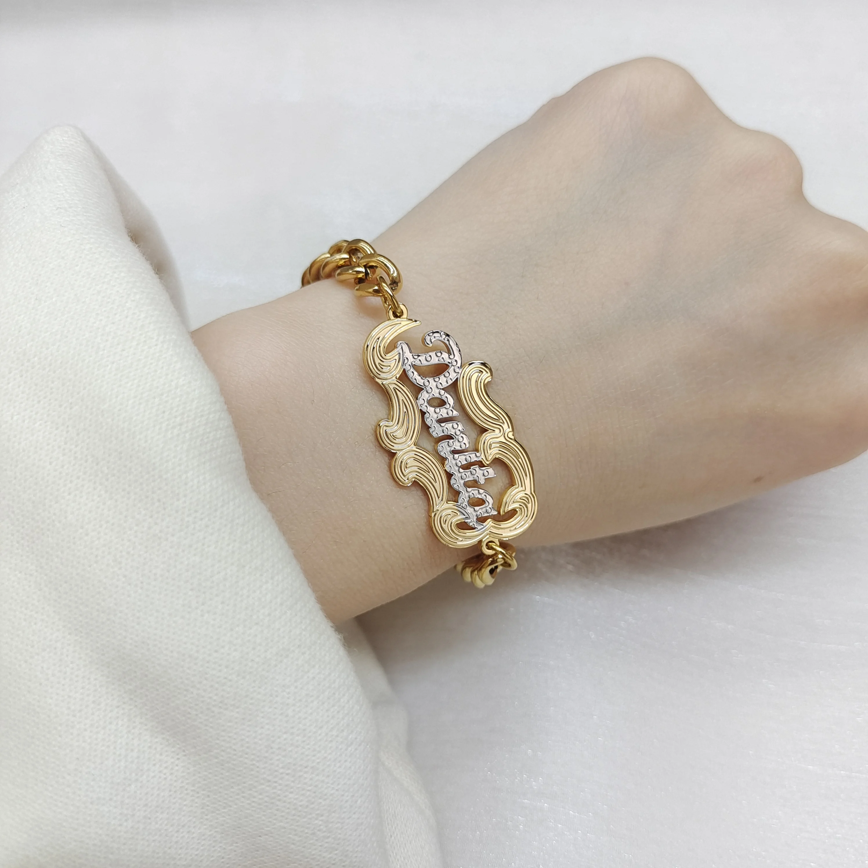 Our Customized Double Plated Name Anklet is a stylish addition to women's jewelry, perfect for gifting on birthdays or special occasions. Crafted with meticulous attention to detail, this anklet features a personalized textured nameplate in two colors, offering a unique and fashionable look. Made from durable materials, it ensures longevity and style for everyday wear. Elevate her ensemble with this personalized accessory, a thoughtful and trendy birthday gift that she'll cherish for years to come."